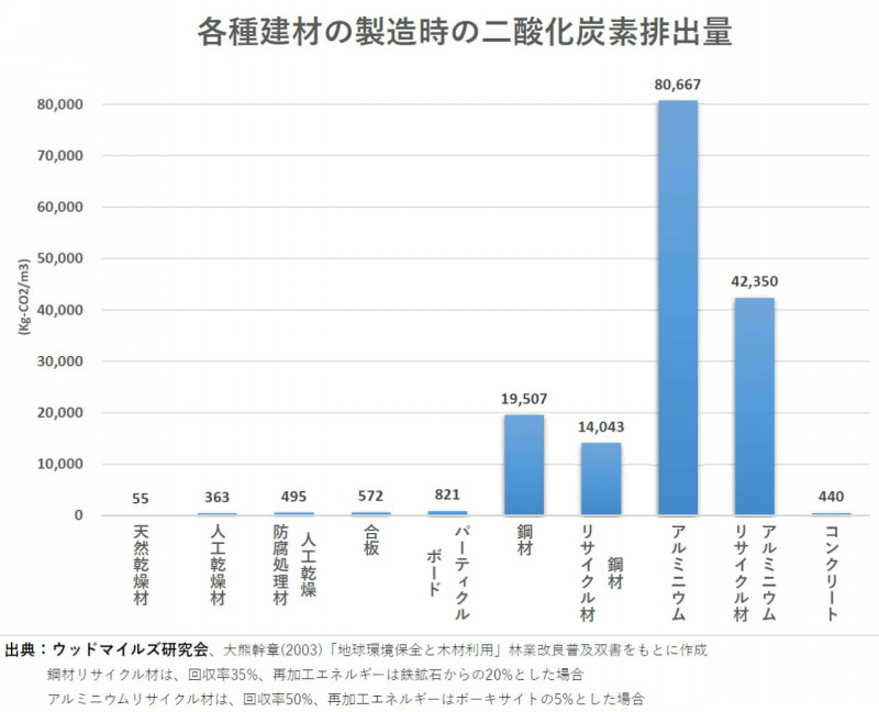 一般的に使われている木材(人工乾燥材)は、製造過程で排出する二酸化炭素の量で換算して比較すると、鉄(鋼材)の約50分の1、アルミニウムの約220分の1という極めて製造エネルギーの少ない建築材料です
