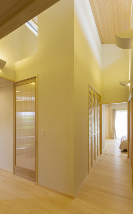 一例ですが、フジモクでは寝室やリビングの出入り口については極力段差を設けないようにしています。一般的には、出入り口の扉の下には敷居(しきい)というものが付きます。フジモクで採用する敷居でも段差は3mm程度なので問題はありませんが、フジモクでは扉を上から吊るタイプの上吊り(病院の診察室などみたいなイメージ)にし、段差がないようにすることも可能です。