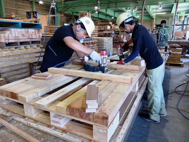 パレットは、桁・上板・下板で構成されています。1台あたり計50か所以上に釘を打ち込むので、とても大変な作業です。グループのメンバー(3~4人)で交代しながら、トントン釘を打ってもらいました。
