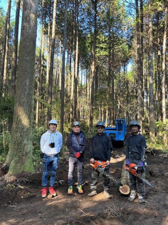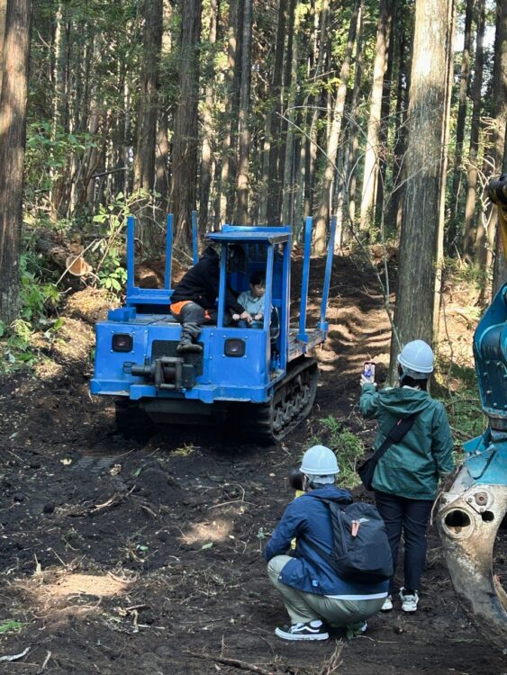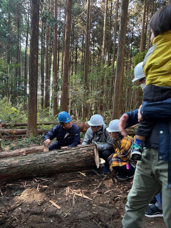 山に到着すると、実際に山でヒノキや杉を伐採している林業の作業員の方達の作業の様子を見学しました。例えばチェーンソーで伐採する様子や、山で活躍する重機を間近に見て、お子様はもちろん大人も大変興味深く見学されている様子でした。