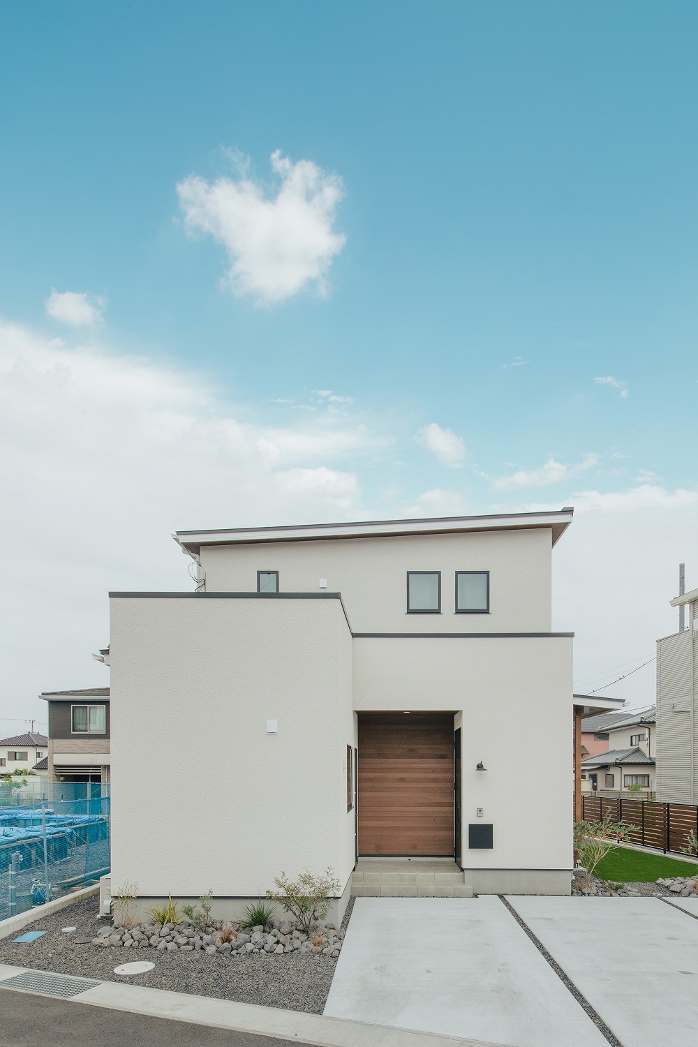 シンプルなBOXと片流れ屋根が重なった佇まい。白い塗り壁風の壁や杉の天然木の本物の質感が温かみをプラスしています。