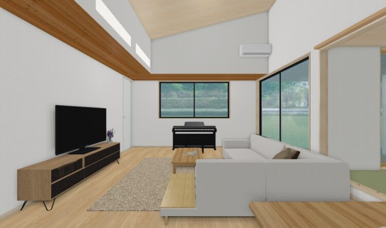 リビングの勾配天井はシナの板張りに、やわらかな光が入る天窓や光の広がりを感じる間接照明を随所に取り入れました。