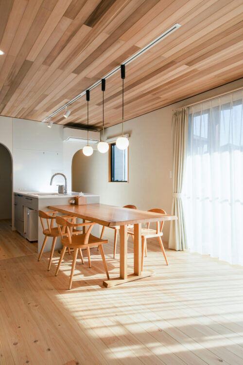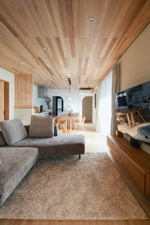 ・天井全体に施したレッドシダーの板張りが上質と美しさを演出するLDK。