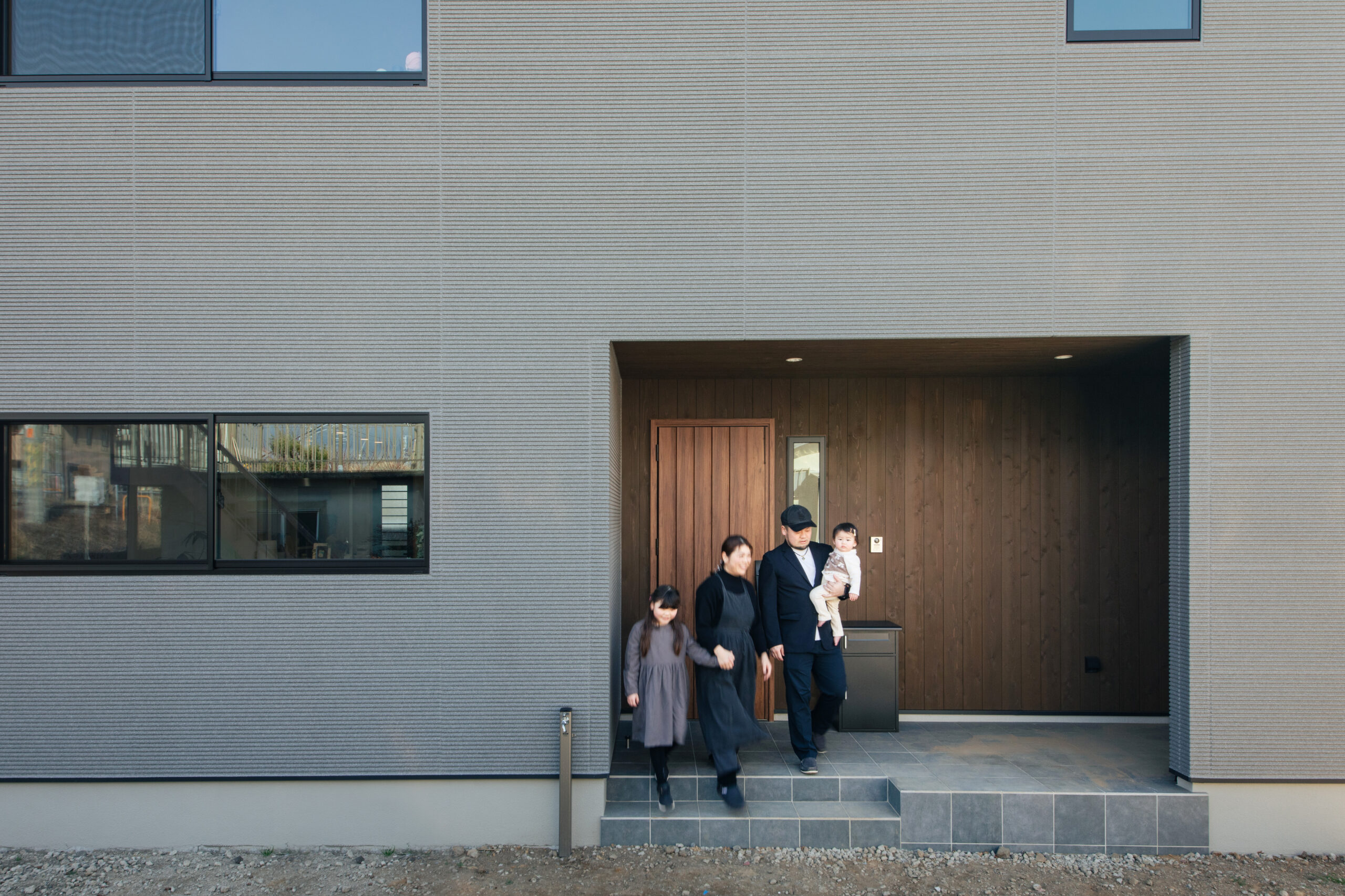 私(奥さま)が小さい頃、両親の仕事が忙しく学校から帰っても家族で夕飯を共にすることができないことが多かったので、子どもが帰宅した時は、「お帰り」と迎えてあげたいというのがずっとありました。玄関に設けた木枠の小窓は、リビングとやさしくつながる”見守りの窓”。子どもたちが帰宅したとき、リビングにいながらその様子をそっと感じ取ることができます。「おかえり」と自然に声をかけてあげれるのも小窓のおかげです。