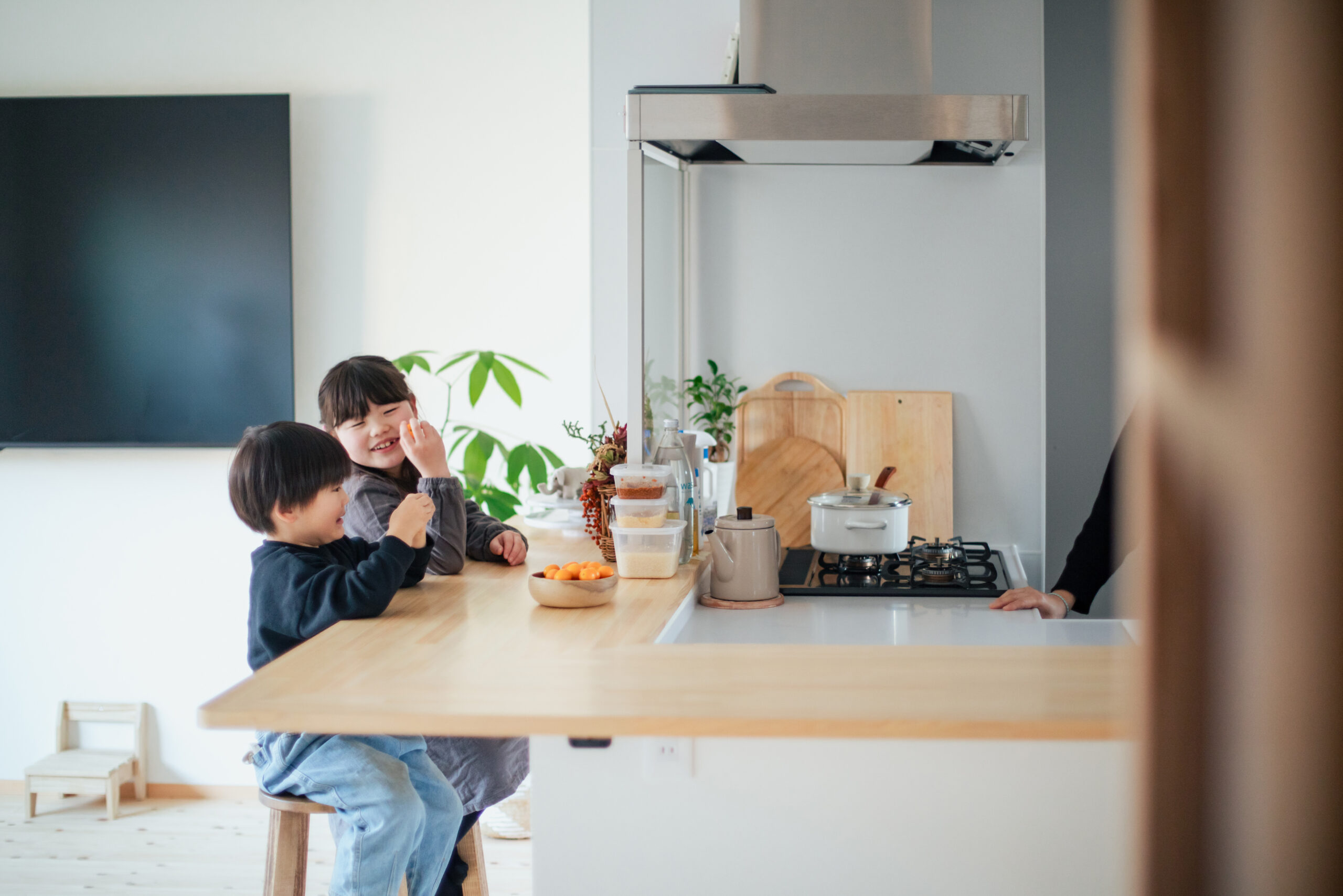 家づくりの中で特に大切にされたのは、料理を通して子どもたちと過ごす時間と、遊ぶ姿を見守れること、そして、日常の家事にかかる負担を少しでも軽減させることでした。